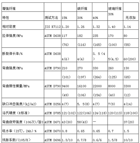 根據(jù)碳纖維長度、表面處理方式及用量的不同,還可以制備綜合性能優(yōu)異、導(dǎo)電性能各異的導(dǎo)電材料,如抗靜電材料、電磁屏蔽材料、面狀發(fā)熱體材料、電極材料等。碳纖維增強(qiáng)尼龍材料近年來發(fā)展很快,因?yàn)槟猃埡吞祭w維都是各自領(lǐng)域性能優(yōu)異的材料,其復(fù)合材料綜合體現(xiàn)了二者的優(yōu)越性,強(qiáng)度與剛性比未增強(qiáng)的尼龍高很多,高溫蠕變小,熱穩(wěn)定性顯著提高,尺寸精度好,耐磨,阻尼性優(yōu)良,與玻纖增強(qiáng)尼龍相比有更好的綜合性能,如表所示。
