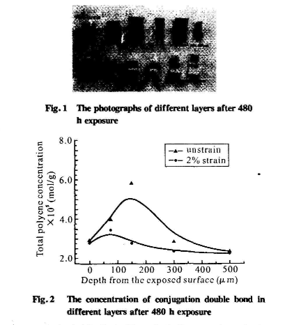 (2)次表層:在該層中,以脫HC1生成共軛雙鍵反應(yīng)為主。該區(qū)域在光老化過(guò)程中會(huì)生成大量的共軛雙鍵,由紫外分析得到,雖然兩組樣總共軛雙鍵數(shù)量基本一致,但受應(yīng)力時(shí)共軛雙鍵層為150 μm-300μm;無(wú)應(yīng)力時(shí)共軛雙鍵層為75 μm~500 μm。表明在次表層,應(yīng)力使試樣脫HC1反應(yīng)更集中發(fā)生在較窄的區(qū)域。