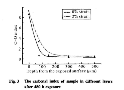 (1)近表層:在該層中,以氧化反應(yīng)為主。該區(qū)域在光老化過(guò)程中會(huì)生成大量羰基,從紅外分析可知,受應(yīng)力時(shí)為0μm~150μm,無(wú)應(yīng)力時(shí)氧化層厚度為0 μm-75 μm;且受應(yīng)力時(shí),試樣的總羰基指數(shù)高于無(wú)應(yīng)力狀態(tài)。說(shuō)明在近表層,應(yīng)力促進(jìn)PVC的氧化反應(yīng)發(fā)生。