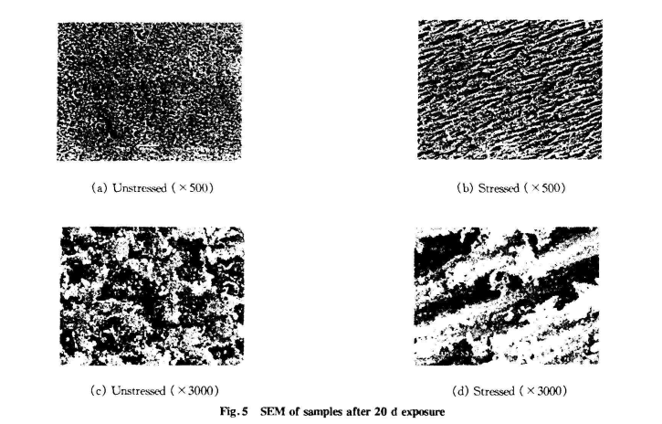 綜上所述,應(yīng)力通過(guò)引發(fā)PVC材料聚集態(tài)結(jié)構(gòu)的變化—— 取向和微裂紋的產(chǎn)生,交聯(lián)度的降低,使氧化反應(yīng)加劇,脫HC1反應(yīng)區(qū)域的集中,從而導(dǎo)致PVC材料的紫外光老化性能發(fā)生改變。