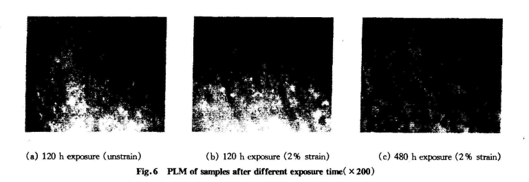 ③表面裂紋的生成:從反射偏光透鏡中觀察發(fā)現(xiàn),應(yīng)力作用下,PVC在光老化過(guò)程中表面有許多微裂紋生成(Fig.6b),這為氧順利進(jìn)入材料內(nèi)部打開了通道。